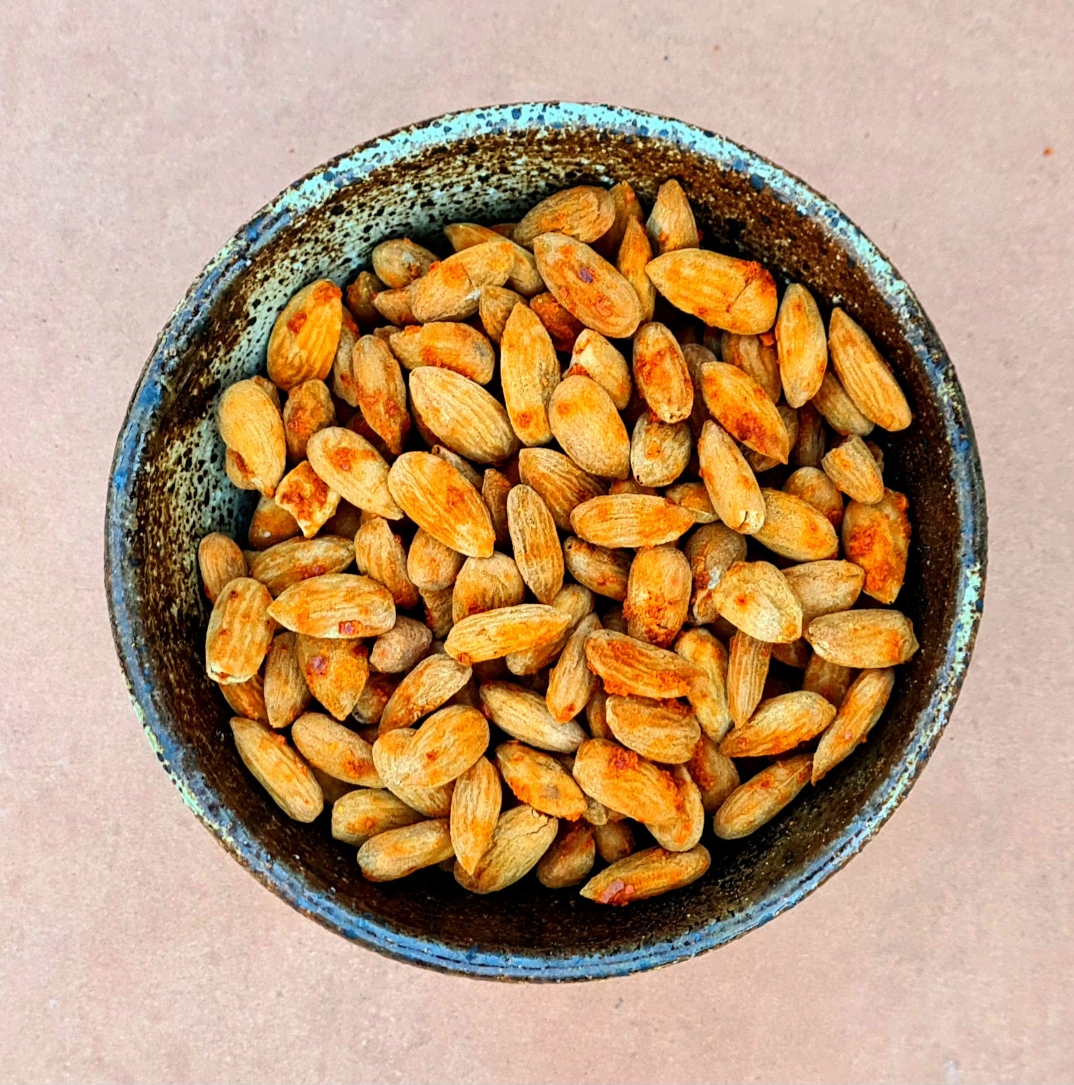 South Australian almonds, Kimchi brine (Cabbage, Daikon radish, Spring onion, Ginger, Garlic, Korean Chilli flakes, Cayenne pepper, Murray River Salt), Korean chilli flakes and Murray River Salt.